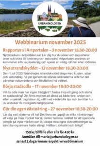 Hej naturskyddare!Snart drar min nya webbinarieserie om naturvård och hållbar odling igång och jag vill bjuda in dig och medlemmarna i din naturskyddsförening att var med. Sprid gärna till dina medlemmar så fler kan ta del av kunskapen.Betalning sker via swish eller faktura.Länken till webbinariet skickas ut till anmälda dagen innan webbinariet.Hoppas vi ses och hörs i november!Med vänliga hälsningarMaria BergUrbanekologen SverigeVid för få annmälda kan webbinariumen komma att ställas in.——————————————————————————